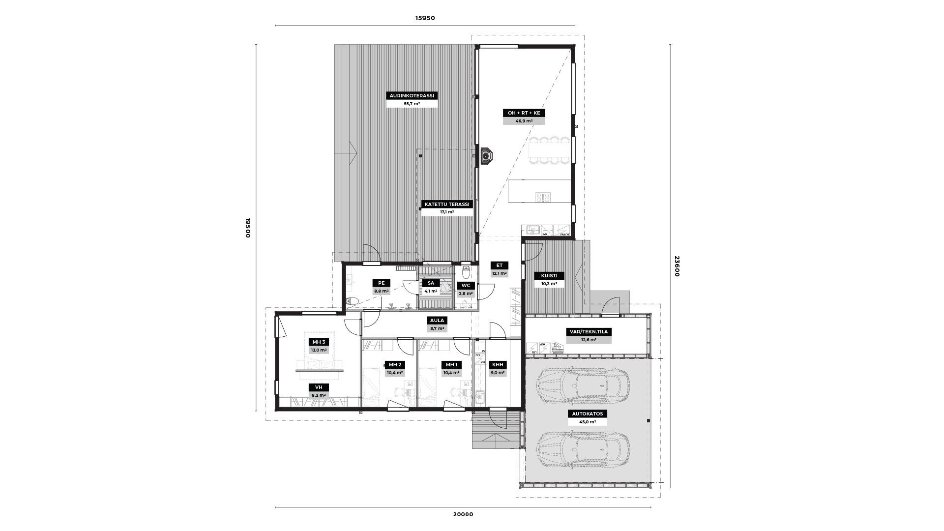 Sunnuntain talonäyttelykohteemme Kaarinassa on upea, 217-neliöinen hirsikoti. L-mallisen kodin tilat on jaettu siten, että toisessa päädyssä on valoisa olohuoneen, keittiön ja ruokailutilan muodostama kokonaisuus, ja toisessa päässä kolme makuuhuonetta sekä kodinhoito- ja pesutilat. Talon yhteydessä on myös kahden auton autotalli.