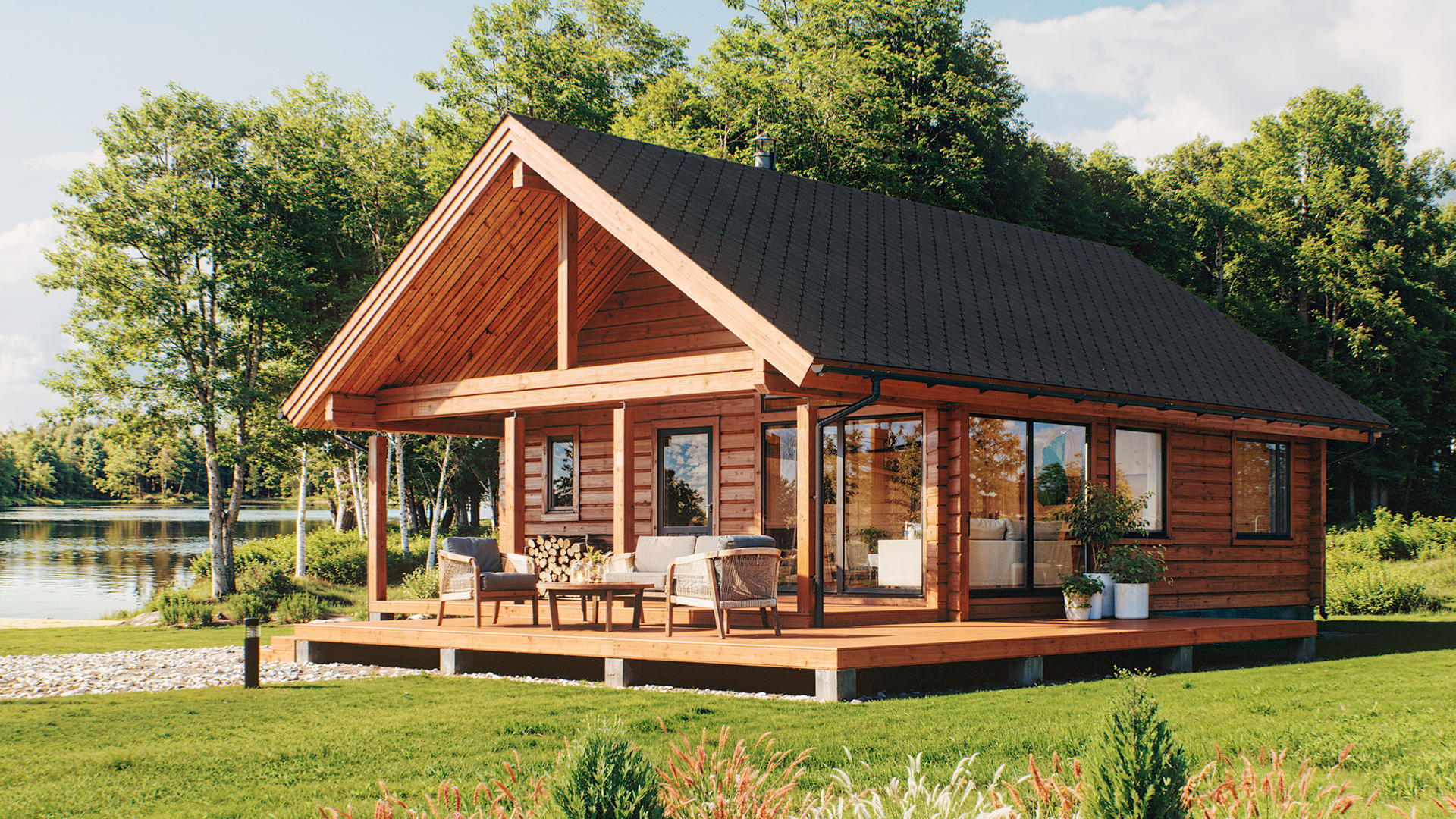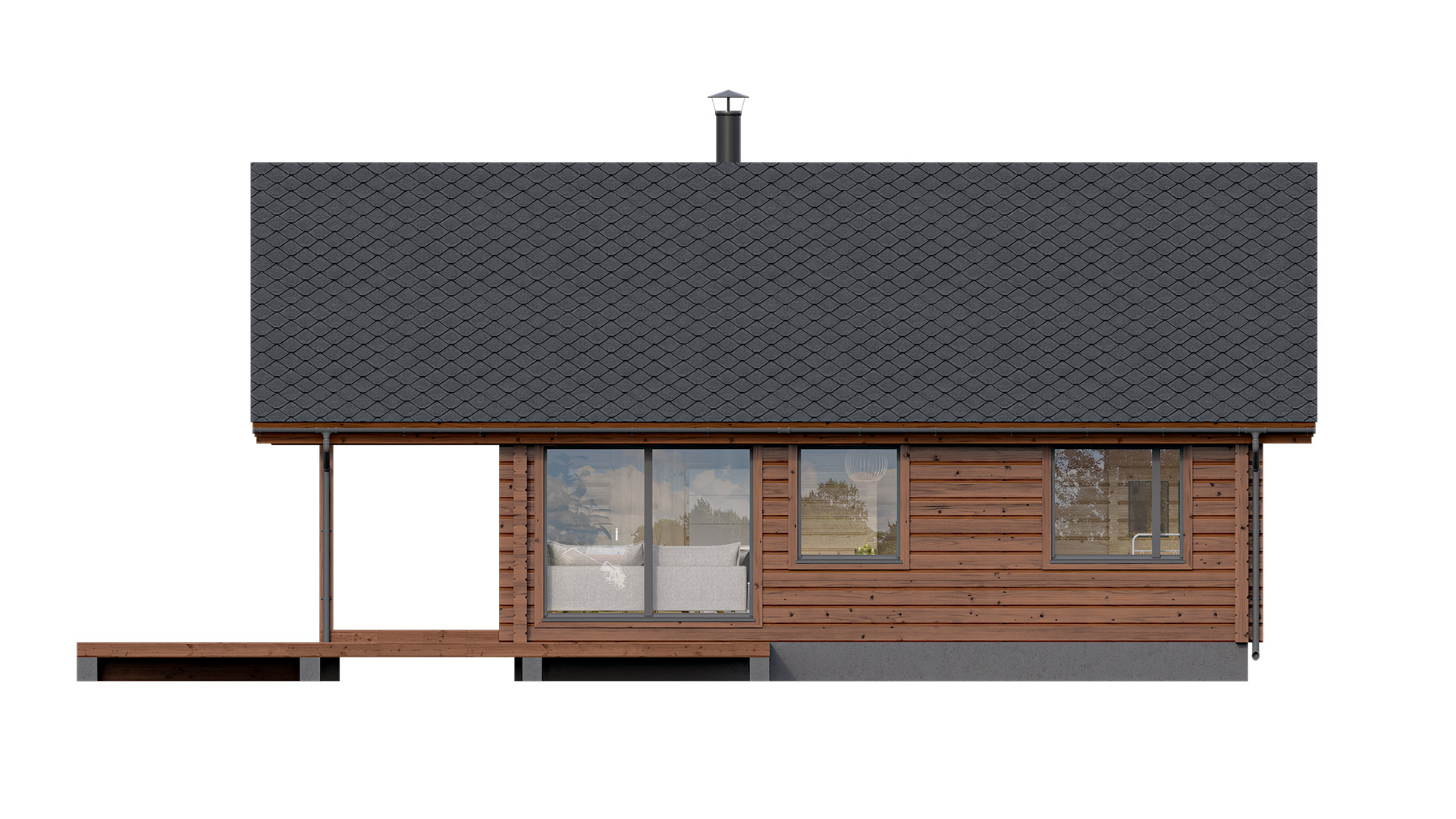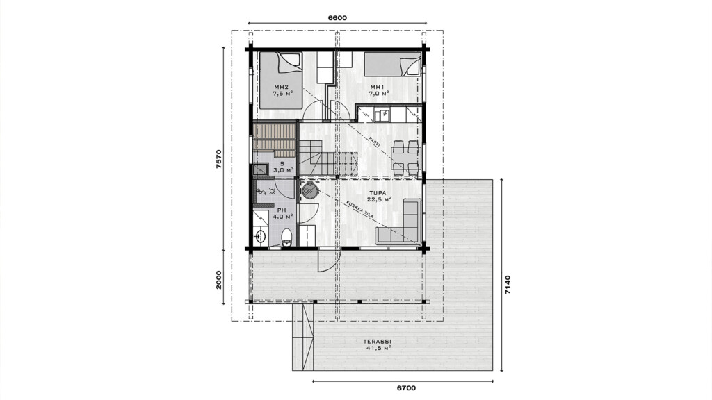 Kitka är en timmerstuga där tradition och modernitet möts på ett naturligt sätt. Sadeltaket och den tydliga planlösningen ger en klassisk känsla, medan den öppna fasaden och de stora fönstren från golv till tak skapar ljusa och inbjudande sällskapsytor. Den generösa terrassen och loftet kompletterar helheten för ett bekvämt fritidsliv.