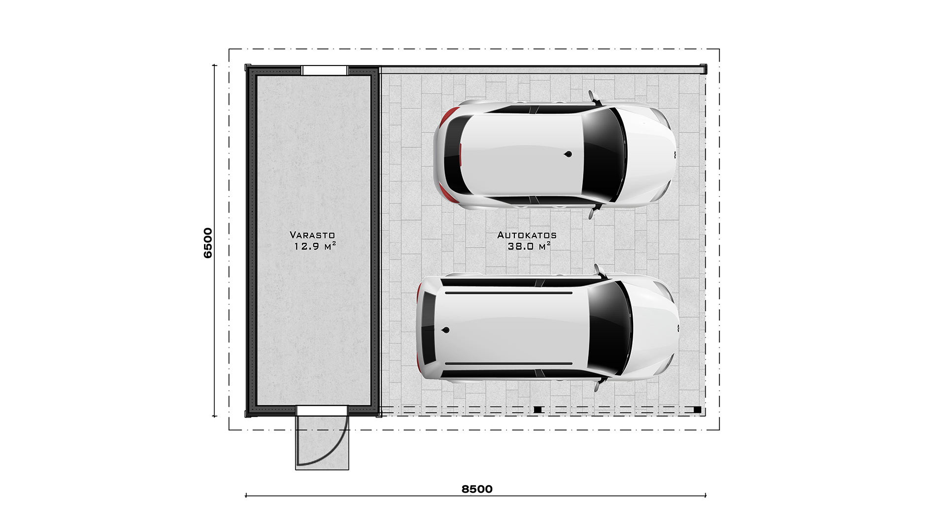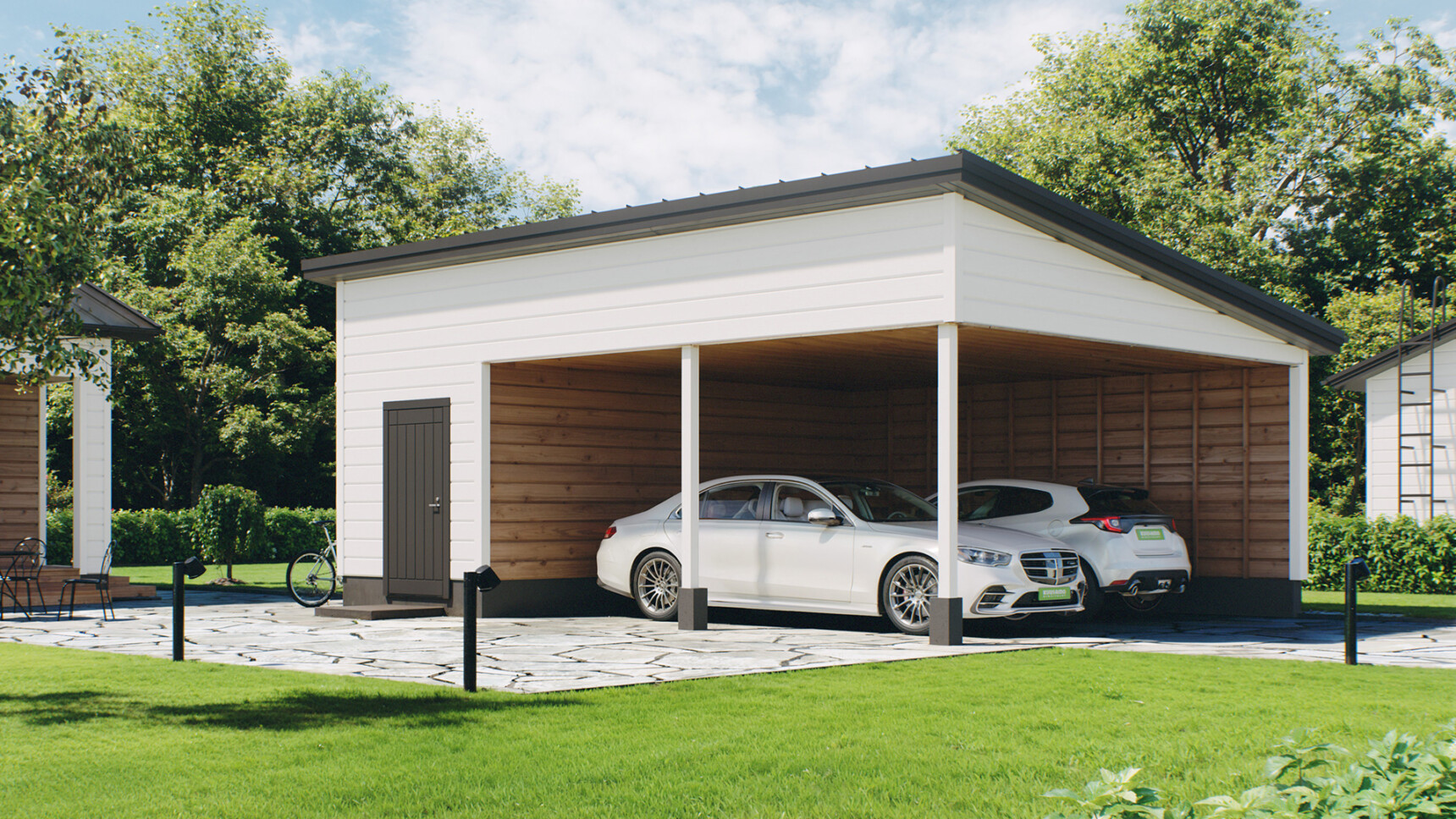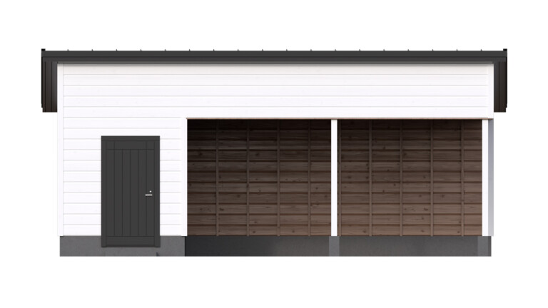Selkeälinjainen pulpettikattoinen kahden auton autokatos yhdistää käytännöllisyyden ja modernin ilmeen. Reilun kokoinen katos tarjoaa suojan kahdelle ajoneuvolle, ja sen yhteyteen sijoitettu varastotila helpottaa arjen säilytystarpeita. Kokonaisuus on suunniteltu toimivaksi osaksi pihapiiriä, ja se sopii luontevasti monenlaisen kodin yhteyteen.