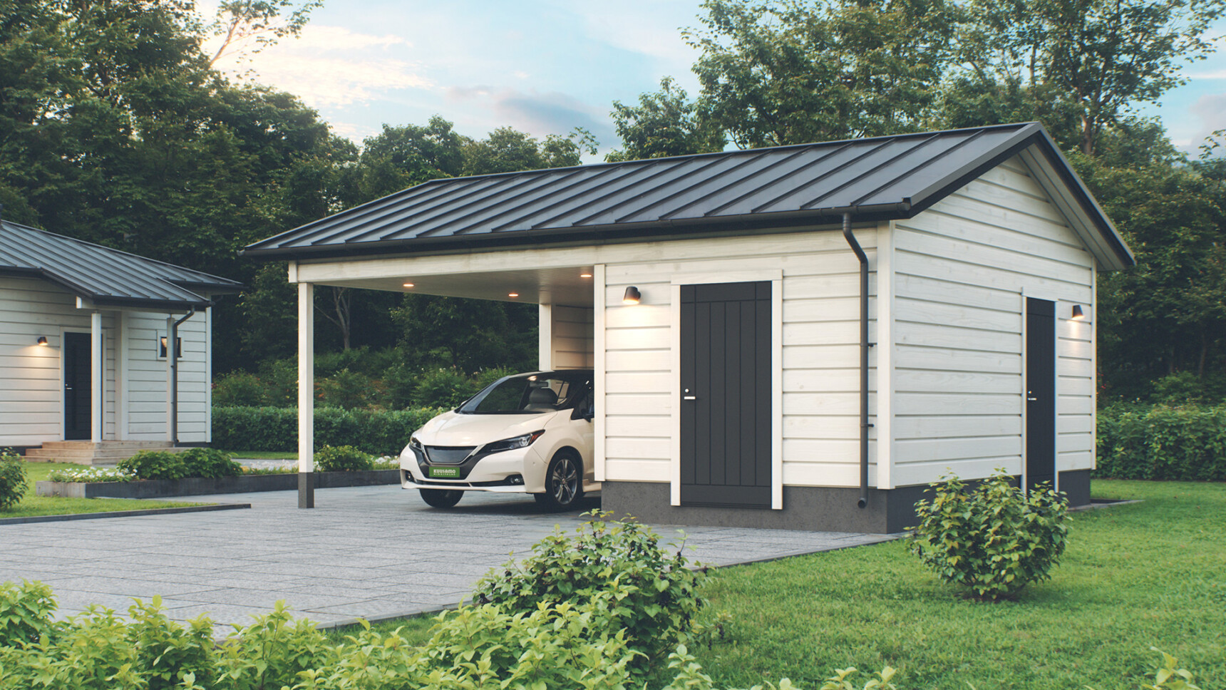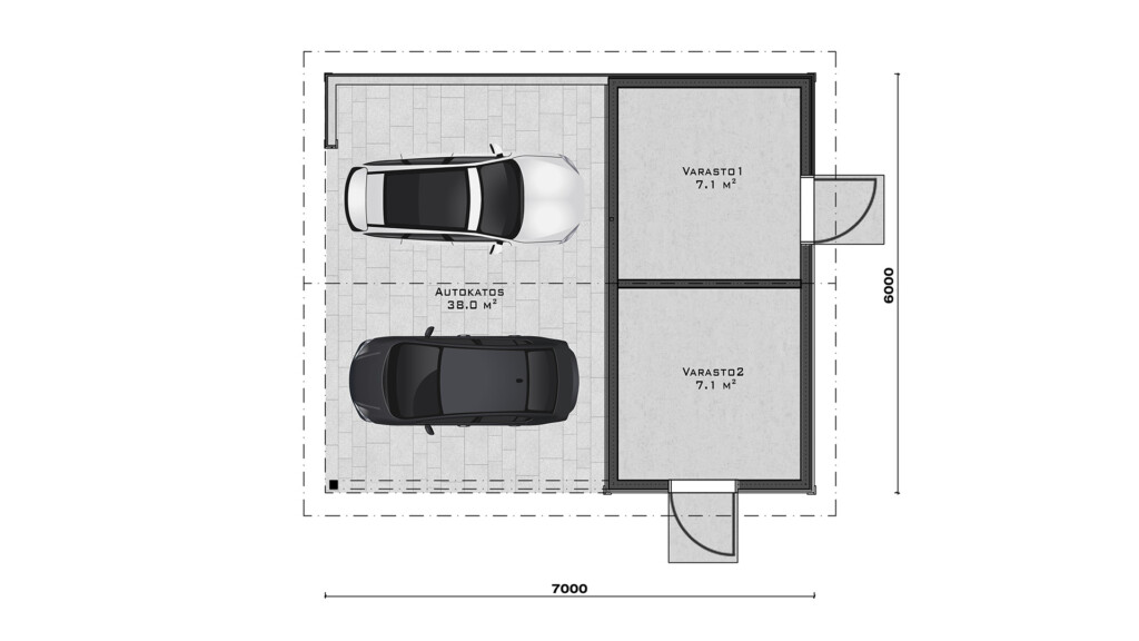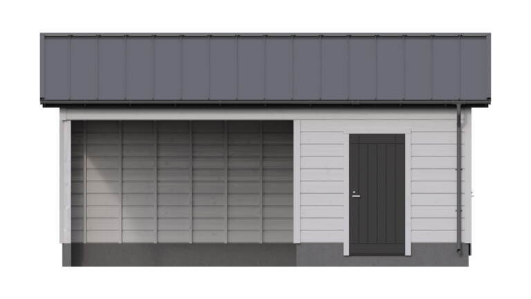 Moderni harjakattoinen autokatos tarjoaa suojan kahdelle autolle ja täydentyy kahdella erillisellä varastotilalla. Molemmilla varastoilla on oma sisäänkäyntinsä, mikä tekee tiloista monikäyttöisiä ja helposti saavutettavia. Tilat soveltuvat esimerkiksi pihatarvikkeiden, työkalujen tai harrastusvälineiden säilytykseen. Selkeälinjainen harjakattoinen muotoilu tekee kokonaisuudesta ajattoman ja pihapiiriin luontevasti sopivan.