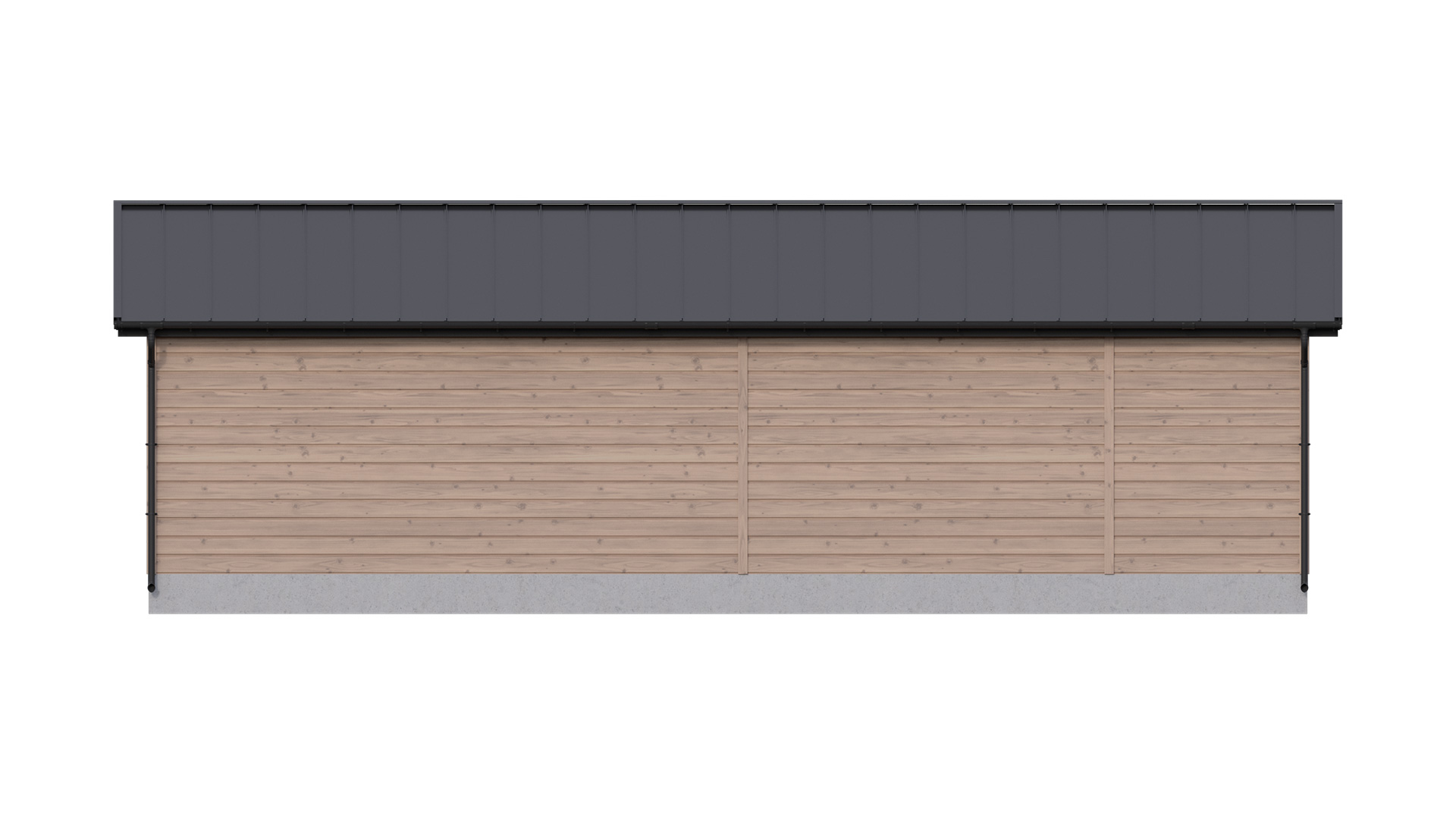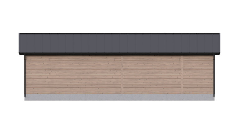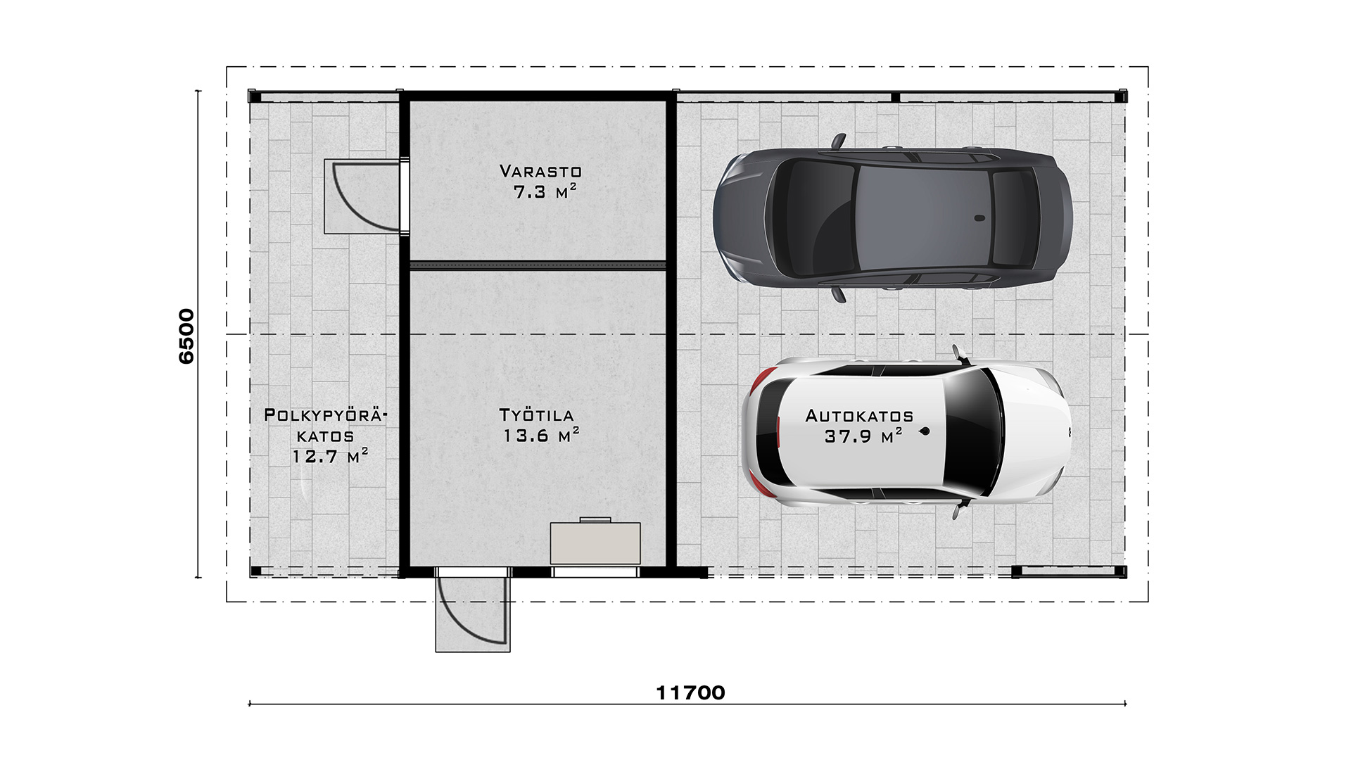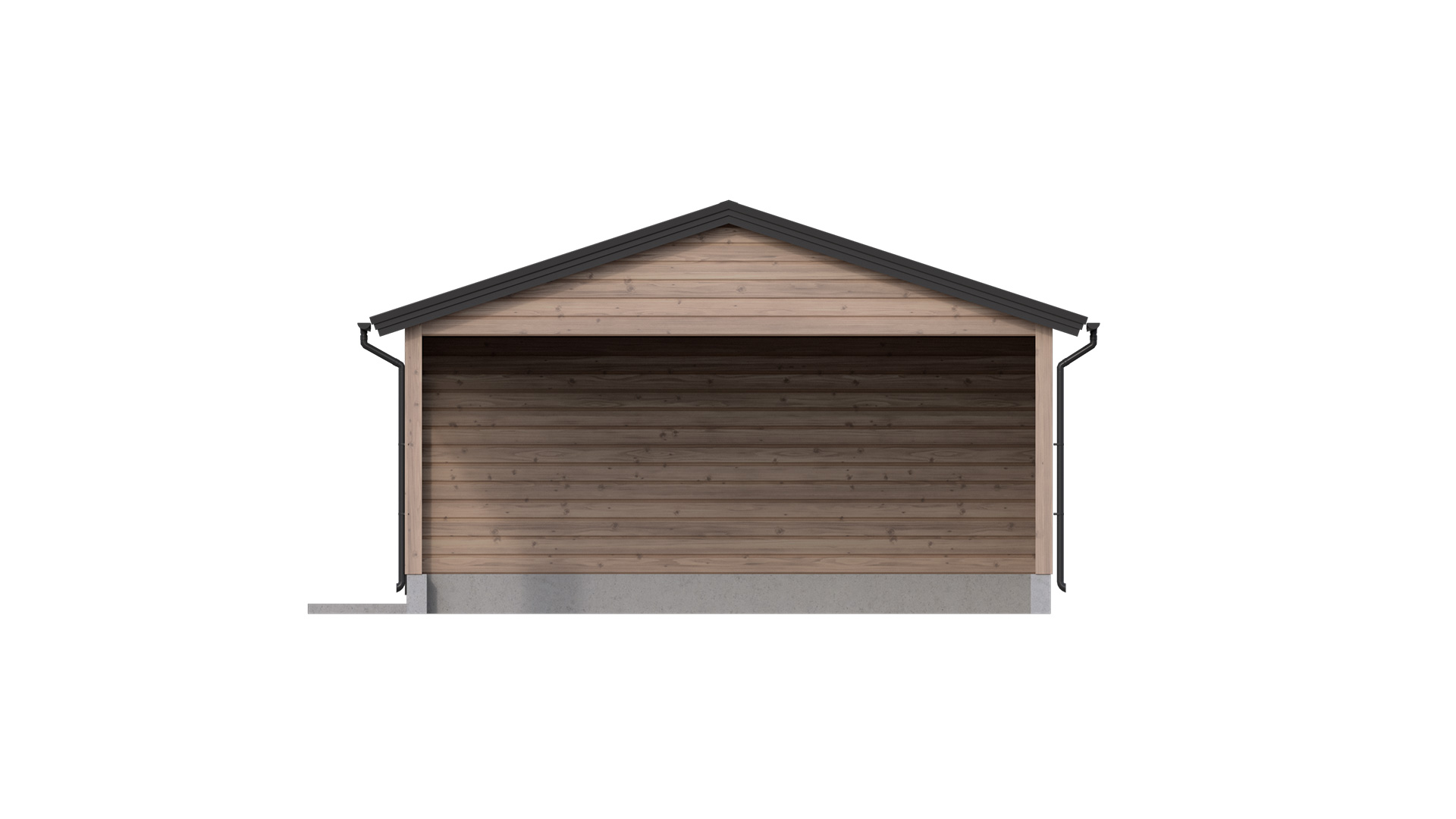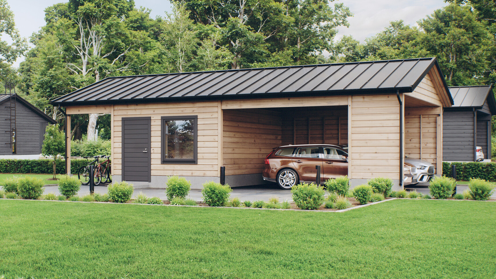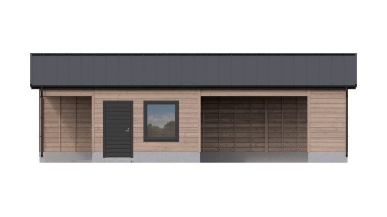 Moderni harjakattoinen autokatos muodostaa monikäyttöisen kokonaisuuden, jossa yhdistyvät auton suoja, säilytystilat ja työskentelymahdollisuus. Kahden auton katoksen yhteydessä sijaitsevat erillinen varasto sekä ikkunallinen työtila, joka soveltuu hyvin esimerkiksi etätyö- tai harrastekäyttöön. Rakennuksen päädyssä sijaitseva erillinen katos tarjoaa suojaisan paikan polkupyörille tai muille pihavälineille. Kokonaisuus on suunniteltu käytännölliseksi osaksi pihapiiriä ja arjen tarpeita.