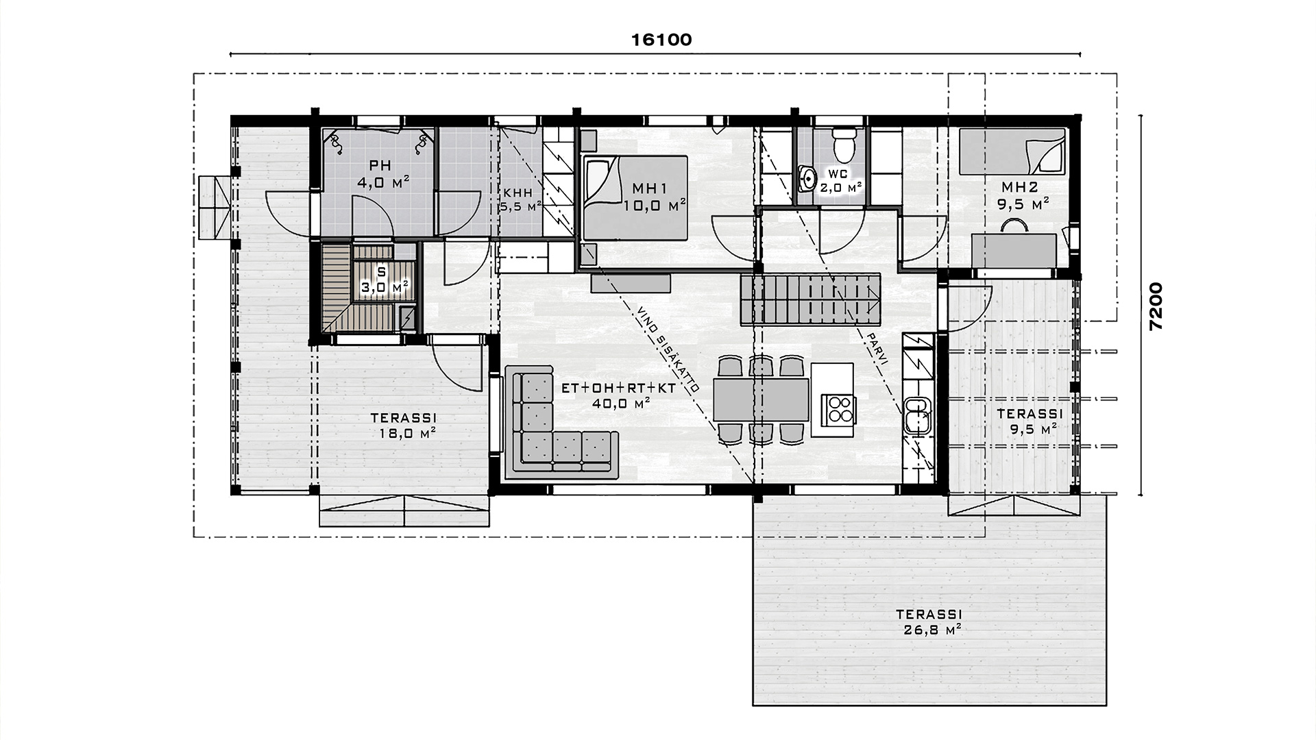 Huvilan keskus on valoisa ja avara olohuone, jonka viisto katto kohoaa korkeuksiin. Saunaosasto on ylellinen ja arjen sujumista helpottaa tilava kodinhoitohuone. Ruokailutilasta on suora reitti huvilan suurelle terassille.