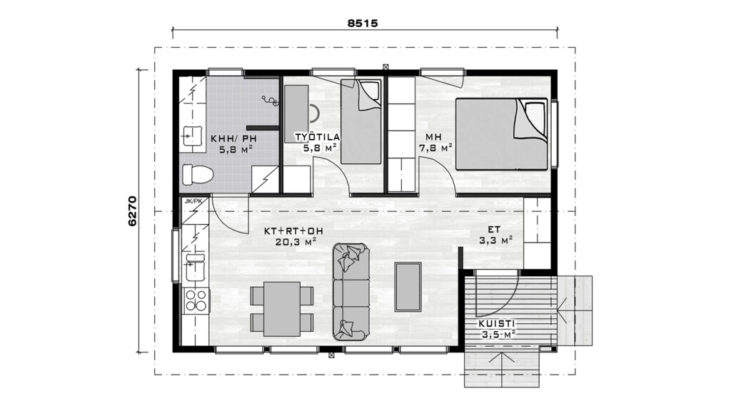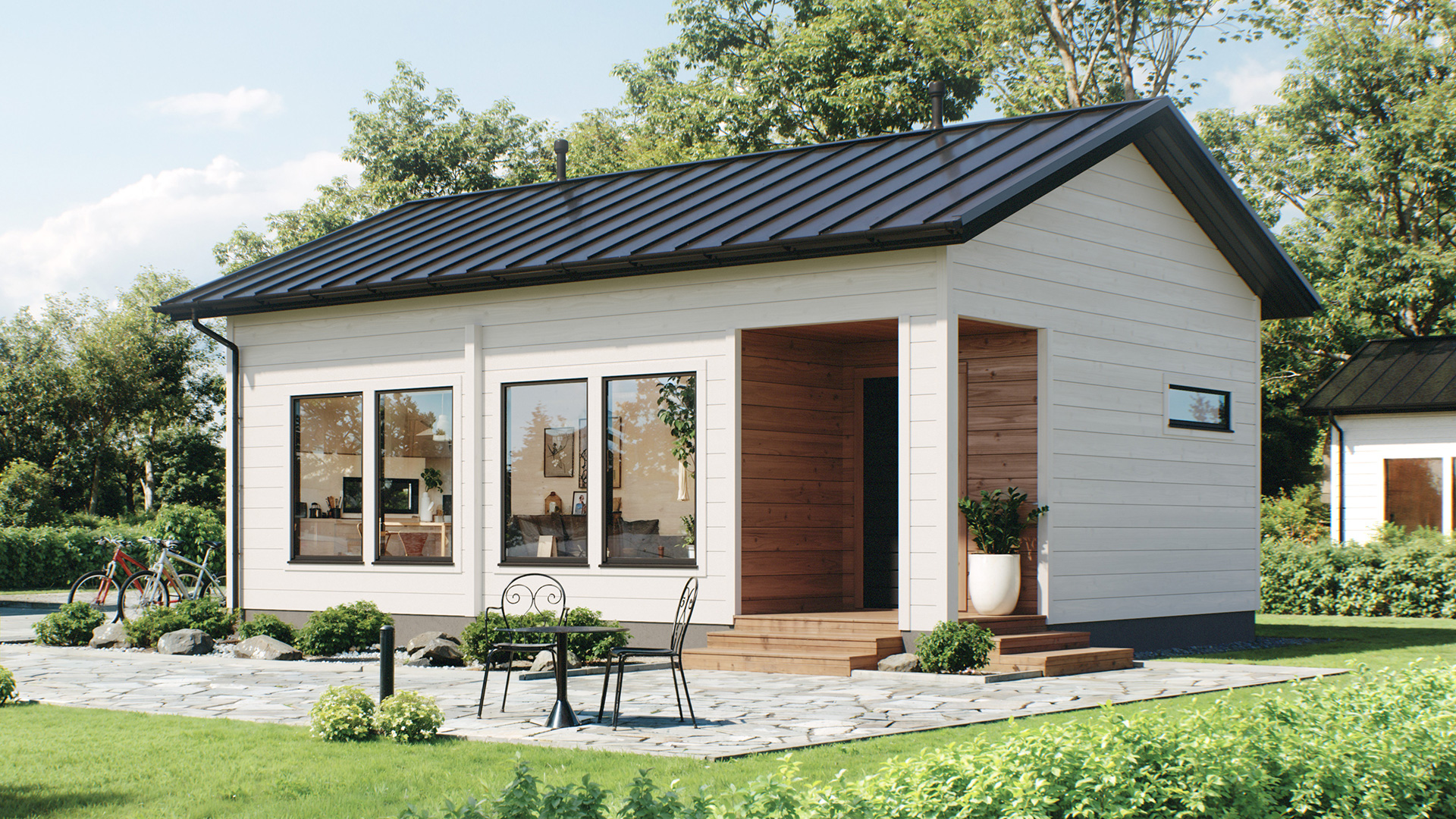 Kaiku 50 on kompakti ja selkeälinjainen talo, jossa jokainen neliö on käytetty harkiten. Avoin oleskelutila ja keittiö muodostavat toimivan kokonaisuuden arkeen, ja erillinen makuuhuone tuo rauhaa asumiseen. Kotitoimistolle on varattu oma paikkansa, mikä tekee mallista sopivan myös etätyöhön. Kaiku 50 soveltuu hyvin niin vakituiseen asumiseen kuin vapaa-ajan käyttöön.